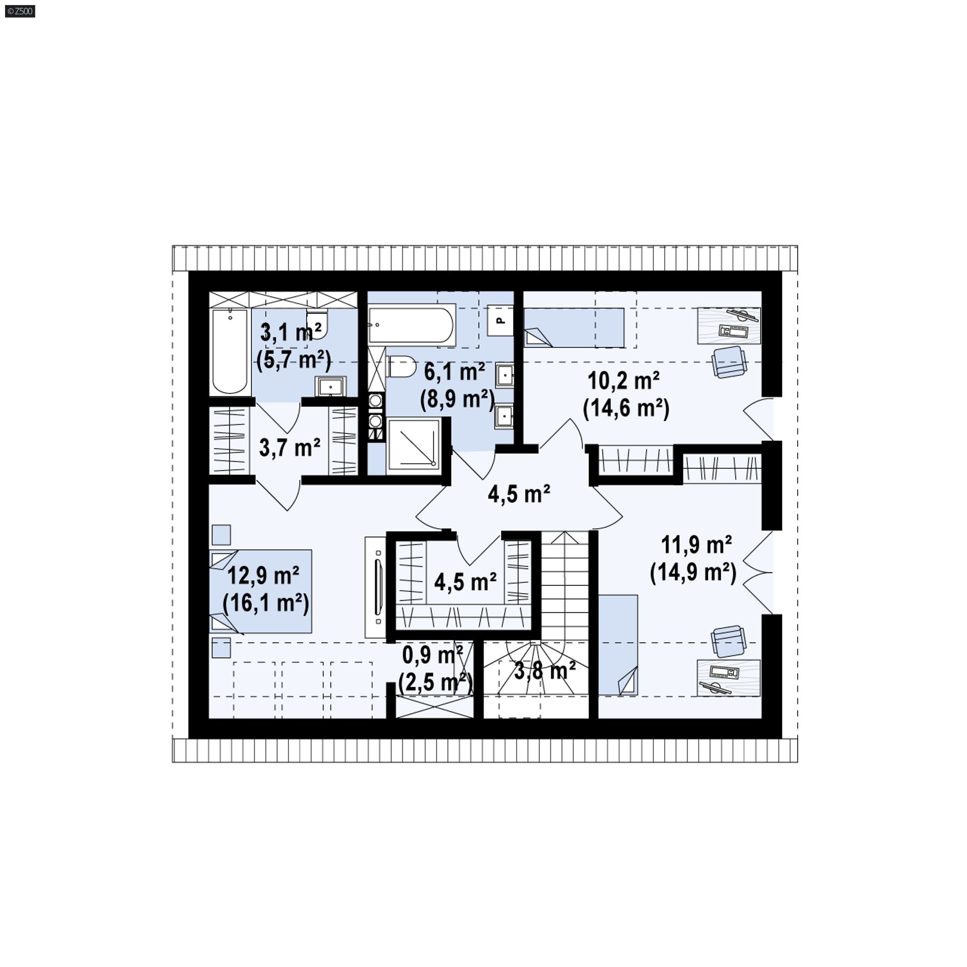 W części parterowej znajduje się część dzienno-rekreacyjna z dużym tarasem. Zaprojektowano dom z małą ilością komunikacji, z trzema sypialniami na poddaszu gdzie znajdują się też dwie garderoby i dwie łazienki. Z183 to idealna propozycja dla wszystkich szukających domu o wysmakowanej formie i funkcjonalnych rozwiązaniach.