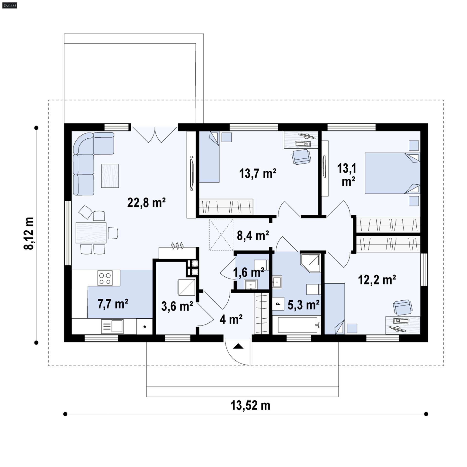 Do sieni wchodzimy przez zadaszone wejście. Dalej znajduje się niewielki korytarzyk skąd mamy dostęp do holu głównego, wc i pomieszczenia gospodarczego, do którego dostęp jest również z kuchni. Kuchnia połączona została jednoprzestrzennie z jadalnią i salonem. Dzięki dużym przeszkleniom pomieszczenie to jest dobrze doświetlone. W części prywatnej domu zlokalizowano trzy duże sypialnie, każda z miejscem na szafę, oraz łazienkę, która pomieści zarówno wannę jak i prysznic.