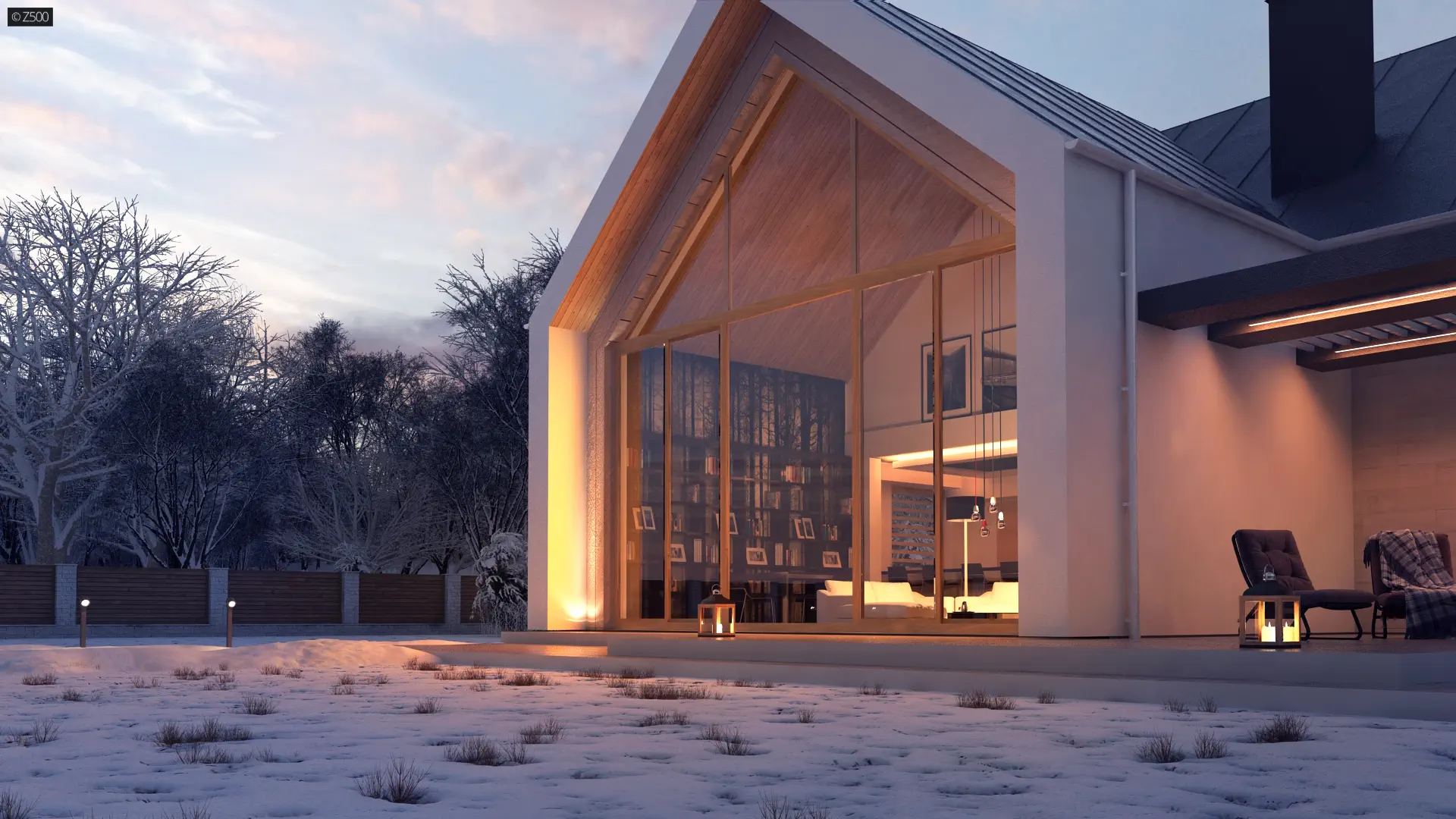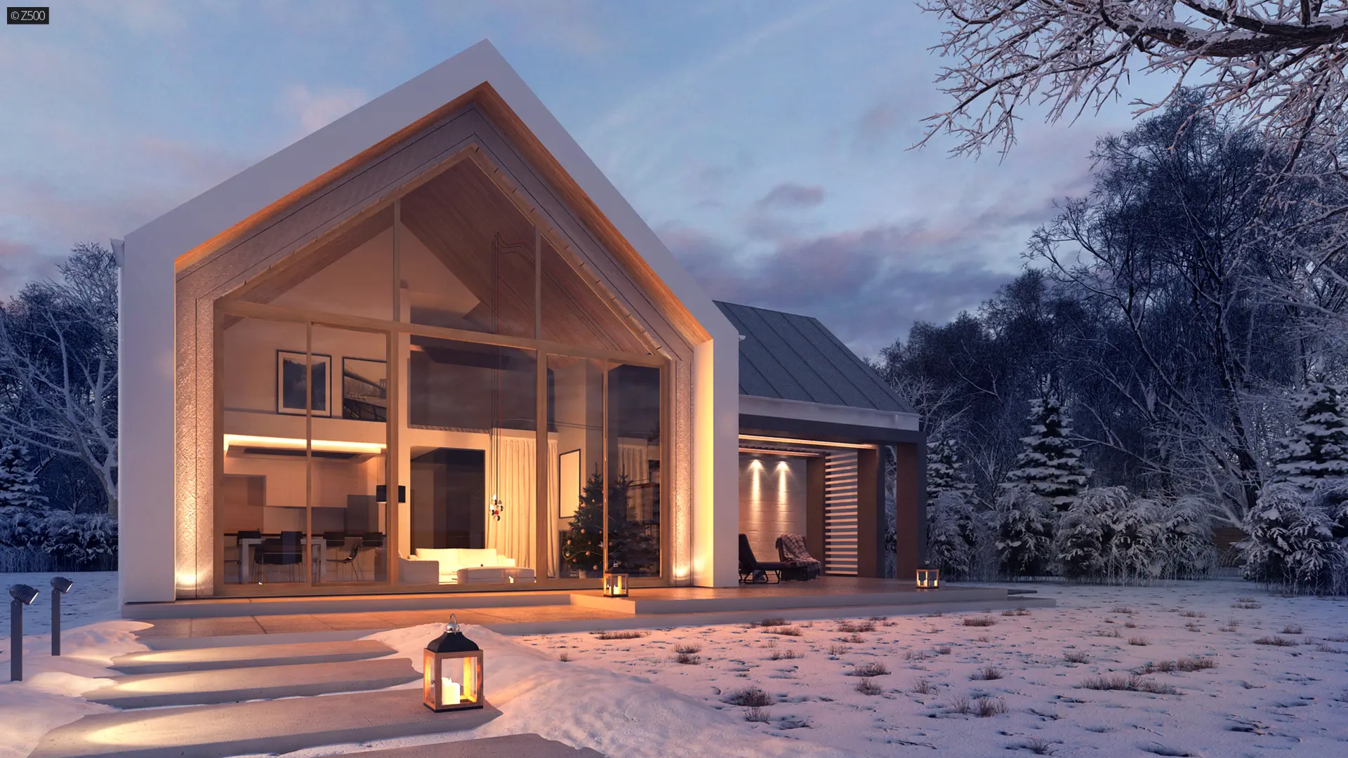 Konstrukcja zadaszenia przedniej części domu jest tożsama z tylną, natomiast elewacje wykonano w jasnych kolorach, z płytek klinkierowych i białego tynku.
