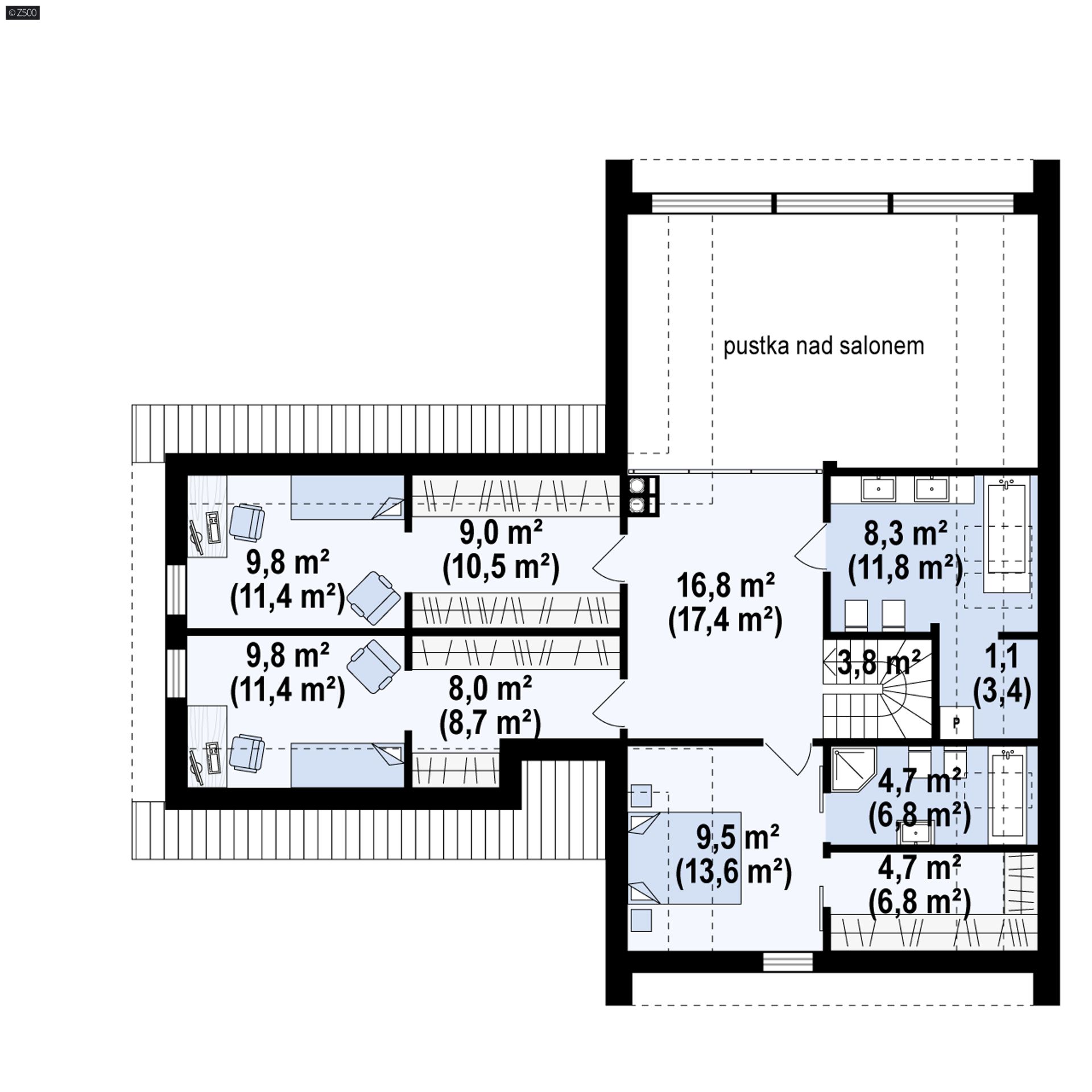 Poddasze użytkowe stanowiące piętro, to nocna strefa domu. Mieści się tam druga główna sypialnia z prywatną łazienką i garderobą, oraz dwie sypialnie z garderobami dla dzieci.