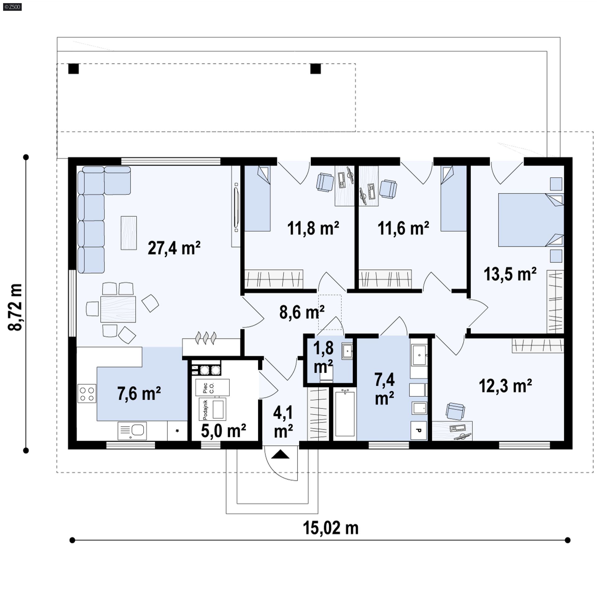Projekt jest propozycją domu dla rodziny z dwojgiem lub trojgiem dzieci.