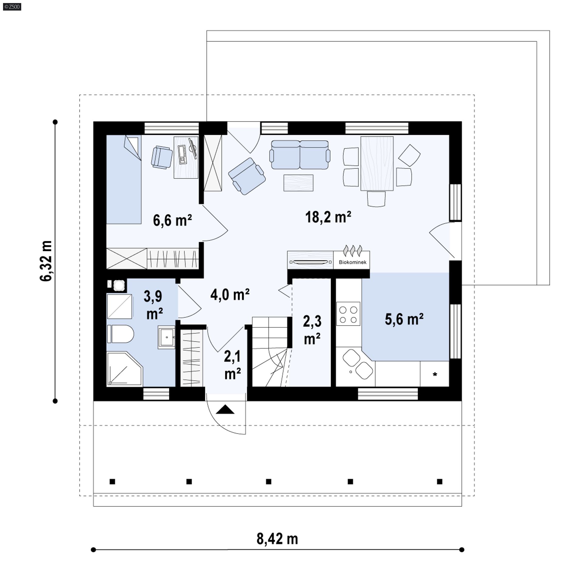 Projekt Z39 D to prosty w budowie i niewielki dom, został przewidziany także na stosunkowo małą działkę. Od frontu, bryłę budynku urozmaica zadaszona weranda. Werandę osłania ażurowa pergola chroniąca przed deszczem, ale przepuszczająca promienie słoneczne, dzięki czemu taras będzie doświetlony.
