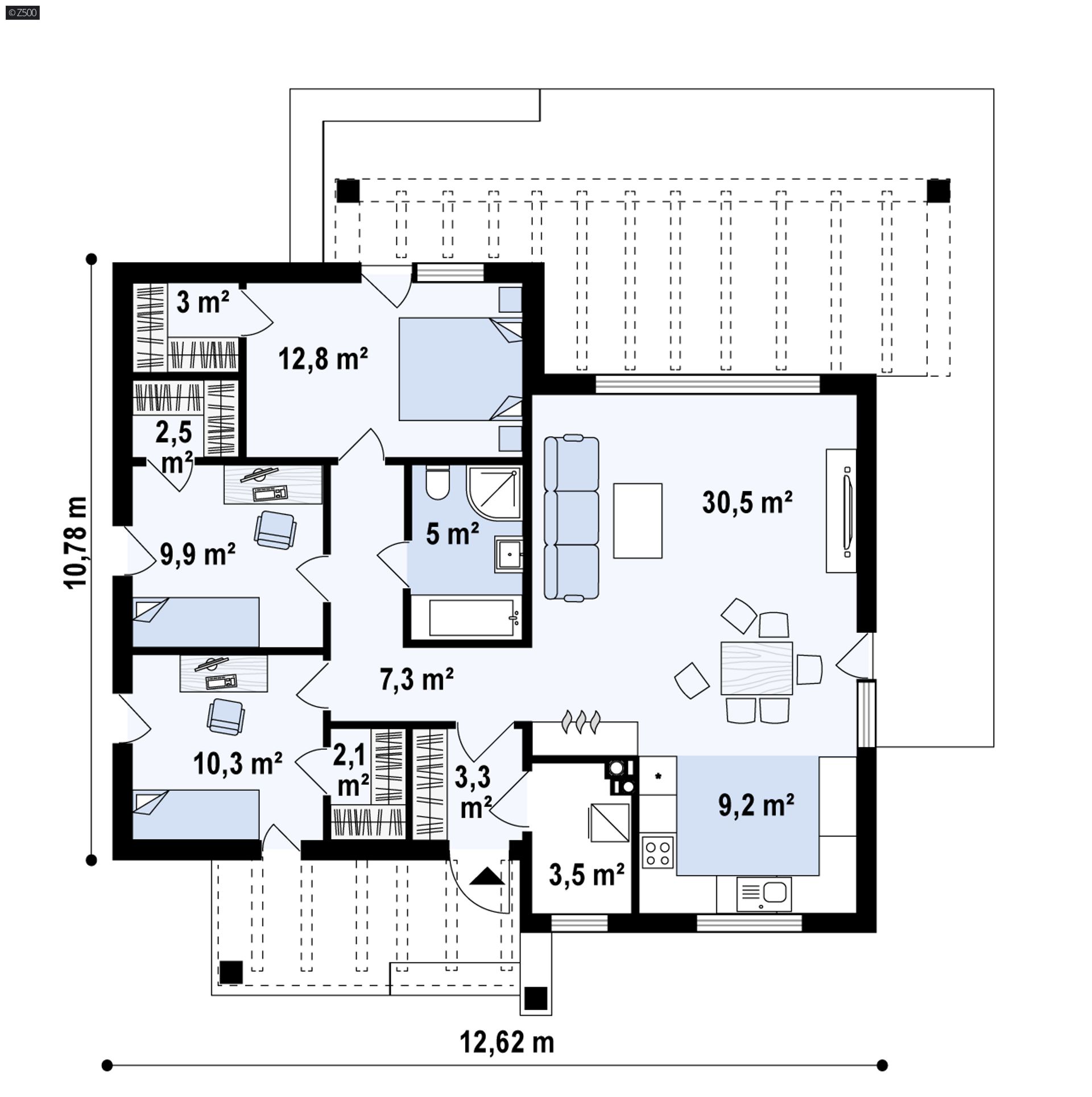 Zx105 D B to zgrabny parterowy dom w nowoczesnym stylu. Prosta, kubiczna bryła z płaskim dachem oraz naturalne elementy wykończenia elewacji dodają mu elegancji i wdzięku. Na prawie 100m² zaprojektowano wygodne i funkcjonalne wnętrze. Strefa dzienna to obszerny 30m² salon połączony z częściowo otwartą kuchnią i wyjściem na spory taras. Dużym atutem projektu jest prosta konstrukcja drewniana i liczne ścianki działowe, co pozwala niemal dowolnie dopasować powierzchnie pomieszczeń. W strefie wejściowej zaplanowano miejsce na dużą szafę. Z sieni dostępne jest wejście do pomieszczenia gospodarczego . Dalej wydzielono część nocną z trzema sypialniami a każda z nich ma osobną garderobę. Zx105 D B to ciekawa propozycja dla zwolenników nowoczesnego stylu. Połączenie jasnego tynku i drewna oraz prostych form zadaszenia tarasów tworzą spójną całość o wysokiej estetyce.